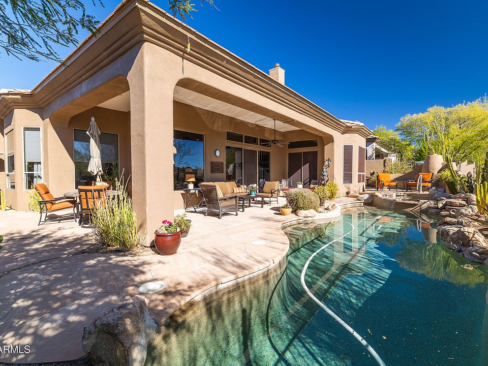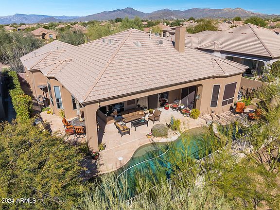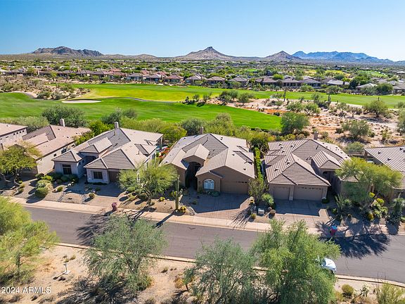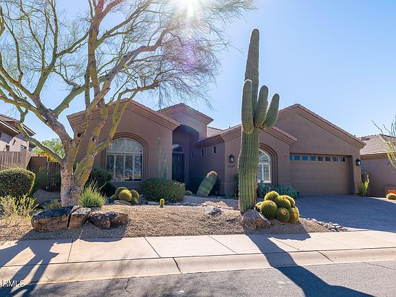 Discover ultimate privacy and luxury in the prestigious Legend Trail of North Scottsdale. This exquisite 2801 sqft home offers a sun-soaked, south-facing backyard for those seeking tranquility. Enjoy serene views of natural washes & double golf course fairways. This updated residence features 3 bedrooms, a den, 2.5 baths & a 2-car garage. The open-concept living area impresses w 12' ceilings and expansive windows, filling the space w light. The gourmet kitchen boasts quartz countertops & a large island. Embrace outdoor living in the resort-style backyard w/ sparkling pool, spa, covered patio, BBQ, & cozy fireplace for year-round entertainment. Enjoy tastefully updated baths & the reassurance of newer roof & HVAC systems. Legend Trail offers golf, tennis, pickleball & fitness center!