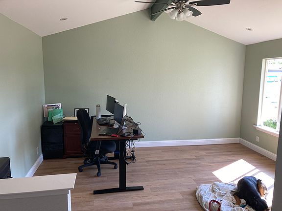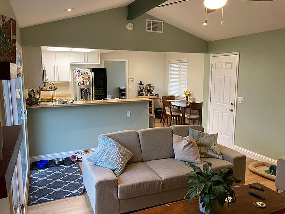 The hall bedroom is 10x10 + small hallway + closet. There is a shared bathroom. There is a separate family room/kitchen and massive backyard. I have one dog and am open to additional pets. Driveway and street parking are available. Limited storage is available in the garage. All appliances provided.