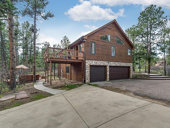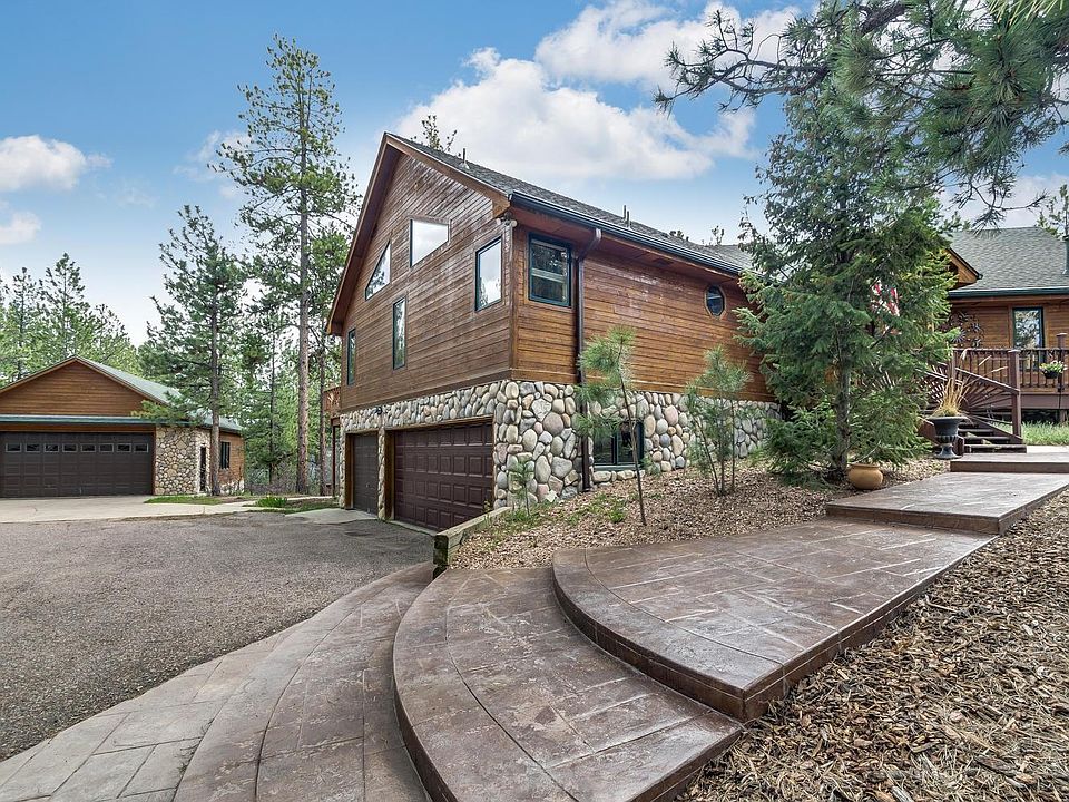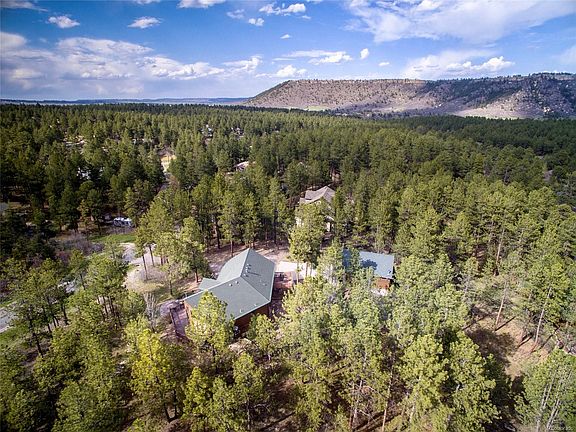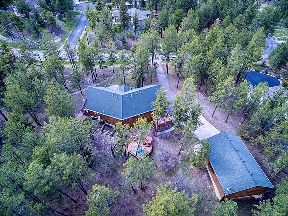 Beautiful home with HUGE 1,000+ sq ft workshop amongst the pines! This 4 bedroom home has GORGEOUS curb appeal. Cedar siding + river rock accents give it a true Colorado feel! Stamped concrete steps lead up to the wrap around porch where you can sit and enjoy nature. Inside, you're greeted with an open floorplan, vaulted ceilings and floor to ceiling windows. Large eat-in kitchen with walk-in pantry. Refinished hardwoods throughout main level. Two bedrooms on main level. Secondary would make a great nursery or office. Large master suite, flooded with light and private deck! Huge walk-in closet with custom built-ins. Finished walk-out basement with family room, 2 guest rooms and full bath. Attached, 3 car garage plus Separate workshop. Fully finished, heated with over 1,000 sq ft of working space. 2x6 construction with extra deep slab to install a lift! Patios, decking and entertaining space everywhere! Enjoy hiking the foothills or play golf at Bear Dance. Close to Larkspur Elementary!