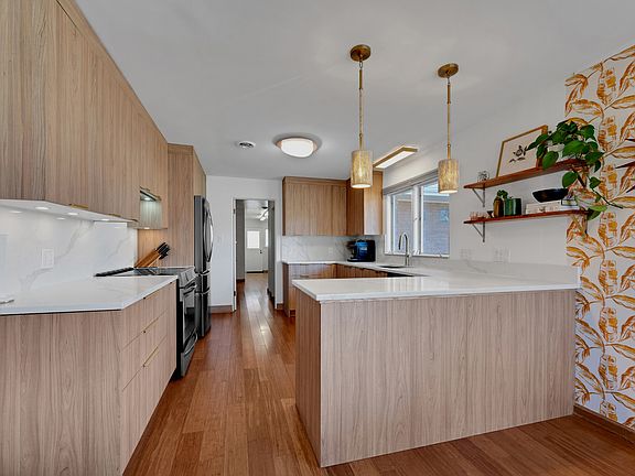 Beautifully updated brick mid-century home in Flossmoor Park. This stunning home boasts four large bedrooms, 2.5 baths, a newly renovated eat-in kitchen and a large private fenced yard and is within walking distance to Flossmoor's historic downtown district, Metra, library, parks and Western Ave. school. The kitchen features new cabinets, quartz countertops and all new appliances including an induction stove. A dual fireplace separates the spacious living and family rooms with floor to ceiling windows overlooking the large backyard. The bedroom wing offers four bedrooms and two full bathrooms. The primary bedroom features two closets and ensuite bath. The second bedroom can serve as a guest bedroom with ensuite bathroom with original tile and mid-century features. A third bedroom has two closets and will accommodate a king size bed. The fourth bedroom has direct access to the backyard making it an ideal work from home office. There is a large walk-in hall closet with separate linen built-ins and two coat closets in the entry hall. Updates include new hardwood floors throughout, new roof, gutters, landscaping and new cabinets in the laundry room.