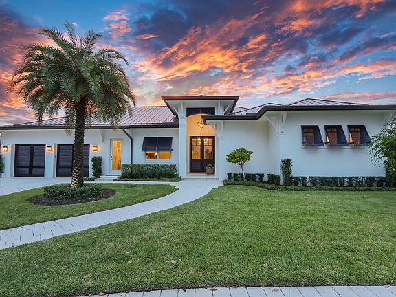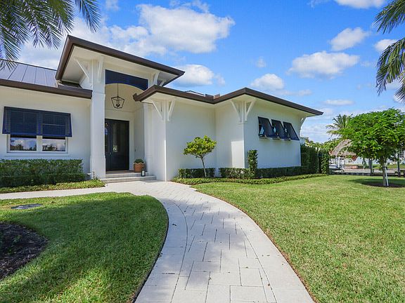 Gorgeous new-construction waterfront home in the heart of Jupiter! Situated on a rare corner lot at the end of a quiet cul-de-sac, this residence offers over 230' of water frontage with direct river, Intracoastal, and ocean access.The spacious 4-bedroom, 4-bath single-story ranch-style home features a split floor plan and Bahamian-inspired design. Highlights include custom mahogany louvered front and garage doors, Bahamian-style shutters and details, high-end impact windows and French doors, French oak beach-style hardwood floors, volume tray ceilings, and vaulted tongue-and-groove ceilings in the foyer and covered patio.The open floor plan is ideal for entertaining, anchored by a chef's kitchen from Palm Beach Cabinet Co. with an oversized island, Wolf propane stove with ... a separate convection steam oven, Sub-Zero French door refrigerator/freezer, and white quartz countertops. All bedrooms include ensuite baths with designer wallpaper, and most feature walk-in closets with built-ins. Guest suites open directly to the backyard and pool area. Additional spaces include a spacious laundry/mudroom with built-in cabinetry and quartz counters, plus smart-home controls for custom lighting, sound system, pool fountains, summer kitchen and more.