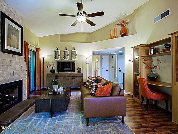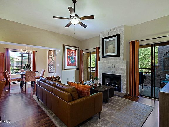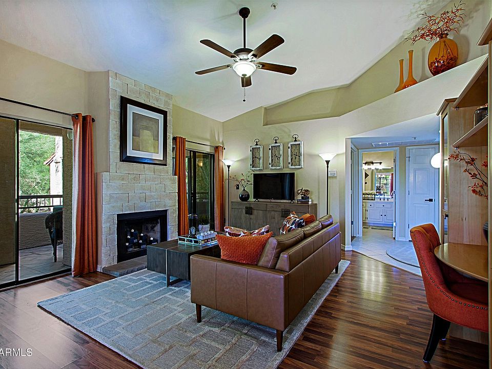 Beautifully remodeled 2 bedroom, end unit with vaulted ceilings in a resort-style community in the heart of McCormick Ranch. Open floorplan with lots of natural light. You get a feeling of warmth & comfort as soon as you walk inside. Kitchen features include all new appliances, new quartz counters, new disposal, dual sink, pantry, and undercabinet lighting. Enjoy the very private tiled balcony with view of grassy grounds & pool, access from primary bedroom and great room, and storage closet w/4 yr old water heater. Other features include new hardware on all doors & cabinets, security door, floor to ceiling new stone on fireplace. Community features sparkling pools, hot tub, pickleball, tennis, & walking paths. Water is inc in HOA. Close to greenbelt, golf courses, shopping, dining & hwy