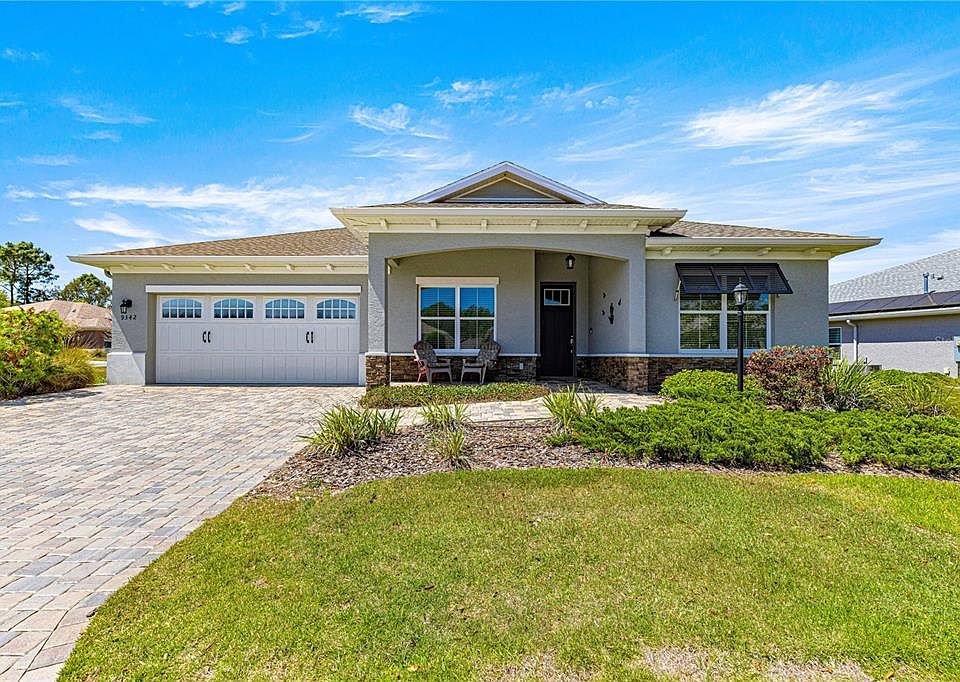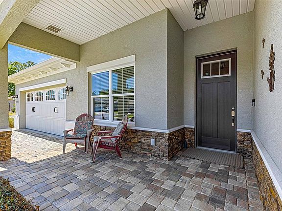COMPARE THIS STUNNING PROPERTY TO NEW CONSTRUCTION - ALL THE UPGRADES HAVE ALREADY BEEN DONE! Very Popular Ariana Model Single-Family SMART Home w/15 SOLAR PANELS located on a PREMIUM CORNER LOT with GREEN SPACE/RETENTION AREA behind located in the Longleaf Ridge 1 Neighborhood of OTOW 55+! As you approach the home notice the recently sealed enlarged paver driveway and front walk, welcoming you to an inviting front porch! As you step inside the formal foyer, notice some of the upgrades to this home: 8 ft. tall entry and interior doors, rectangular tile floors, and high 9 ft. 4 ceilings! To the right is the guest suite with guest/hall bath with tile tub surround, comfort height toilet, and quartz topped vanity and the guest bedroom in the front of the home providing a true split bedroom plan! Adjacent to the guest suite is the Flex Room, and more natural light! Moving through the home you enter the OPEN CONCEPT living space with Gourmet Kitchen & Great Room. The kitchen has been nicely upgraded with 42” top cabinetry, quartz counters, massive island with custom pendant lights, under cabinet lighting, custom glass backsplash, high-end appliances, and recessed LED lighting. The Great Room provides comfortable living space as well as sufficient table space. Step out into the ENLARGED (24 ft. 7 inches X 15 ft. adding 370 sq. ft. of space) finished Florida Room and enjoy the GREEN SPACE VIEWS! Step outside to find an ENLARGED paver patio cover the entire length of the back of the house! The primary bedroom is in the back left of the home for privacy. The primary en suite bath provides a fully enclosed step/roll in glass shower enclosure with custom tile and a seat! Also included is a double sink vanity w/quartz counters and comfort height toilet. The owners upgraded the walk-in closet with built-ins and opted for the added door to the laundry room! The laundry room includes high-end front load appliances, upper and lower cabinets with a sink, and wine fridge! The garage has an additional 4 ft. extension with an epoxy floor finish, and a MINI SPLIT HVAC that provides AC &/or heat! *** SOLAR PANELS ARE 100% PAID FOR & TRANSFERABLE TO NEW OWNERS. ADDITIONAL ATTIC INSULATION ADDED ABOVE GARAGE AND FLORID ROOM! GOLF CART & SOME OF THE FURNITURE AVAILABLE OUTSIDE THE PURCHASE OF THE HOME! The monthly HOA fee includes basic internet (Bridgenet), roof repair, exterior painting every seven years, irrigation water, exterior maintenance and insurance, landscaping, trash & recycling, 24/7 monitored gates and all the amenities that OTOW has to offer; three pools (2 outside & 1 inside & another under construction), two state of the art fitness centers, pickleball, billiards, archery range, corn hole, bocce ball, tennis, shuffleboard, horse shoes, remote control flying field and race cars, 175+ clubs, woodworking shop (extra fee), library, and much, much more! A golf cart community with access to three shopping centers. Centrally located 20 minutes from the World Equestrian Center, easy drive to 4 cruise ports and/or airports, and close proximity to entertainment complexes in Orlando
