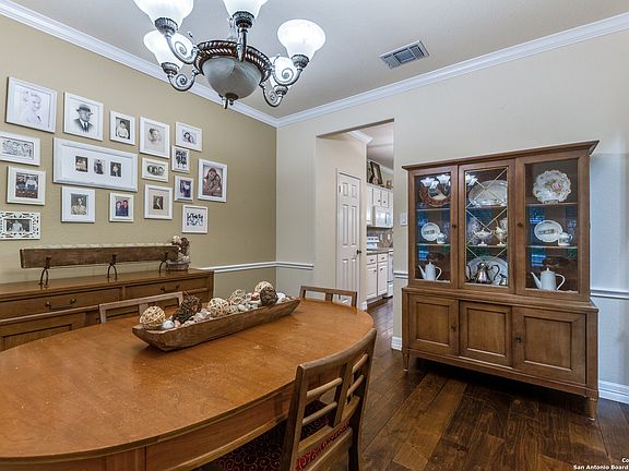 Nestled in the gated community of Cedar Springs in Helotes, this beautiful two-story 2628 sq. ft. home offers 4 bedrooms and 2.5 baths on a greenbelt lot. The spacious layout includes a formal dining room, a dedicated office, and a generous family room with stone fireplace-perfect for entertaining. The kitchen features granite countertops and overlooks the main living space with rich hardwood flooring. The primary bedroom is conveniently located downstairs and boasts a stunning remodeled en-suite bath with updated shower, tub, countertops, tile, and fixtures. Upstairs, you'll find three large bedrooms and a full bathroom. One of the bedrooms includes attic access and is already plumbed for a potential additional bathroom. The fenced backyard provides a serene retreat, with the lot extending to the creek bed for added privacy and space. Enjoy the fantastic neighborhood amenities, including a pool, tennis courts, clubhouse, and a park/playground. Located just minutes from H-E-B, Home Depot, and nearby shopping centers, this home combines comfort, convenience, and community. ** swing in backyard does not convey**