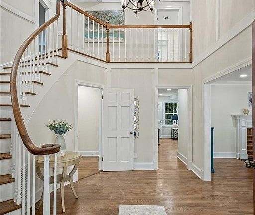 Be welcomed by a winding staircase that adds a touch of elegance and charm to the home's grand entrance. The 1st floor primary suite offers bay windows that frame stunning water views, a full bath, and a walk-in closet.