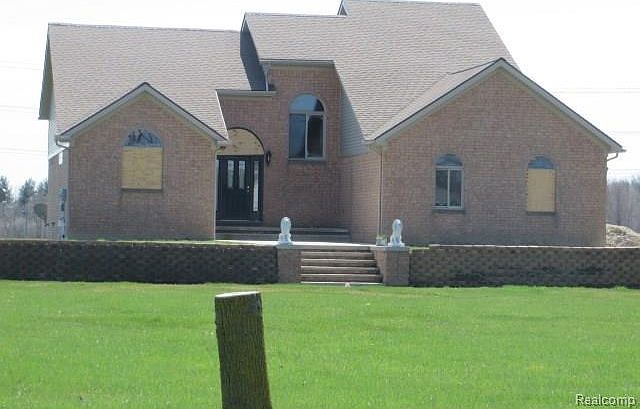 Contemporary brick split level with a first floor master bedroom & bath. Spacious great room with soaring ceilings & cozy fireplace. Large kitchen & dining area, two extended bay door walls, first floor laundry, and a den/office off the entry. Three bedrooms upstairs with a bridge separating the bedrooms overlooking the great room. Hardwood flooring through-out the living area, bedrooms, and kitchen. Great 4.42 Acre parcel! Large full basement has plenty of storage. "Bank Owned Foreclosure" "Not a short sale" Easy, quick purchase process $1,000.00 EM deposit with offer. Subject to Bank Addendums.
