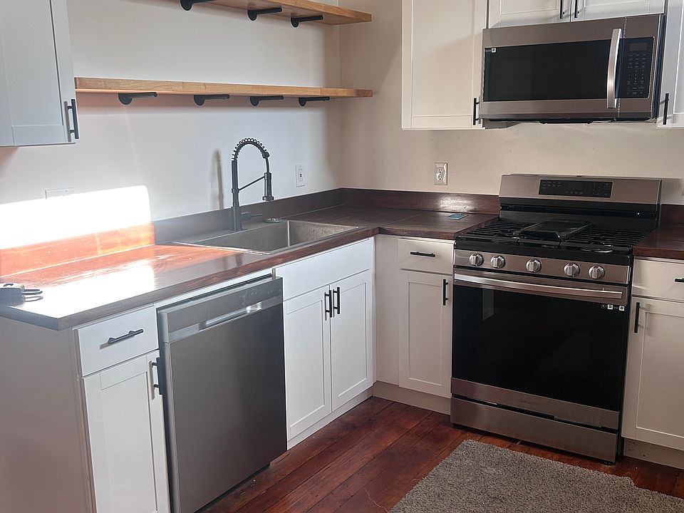 Modern kitchenStainless steel appliancesRefinished wood countertopsPlush carpet in bedroomsOpen shelving