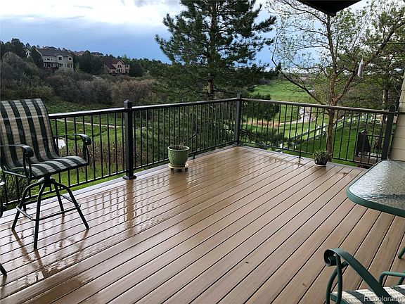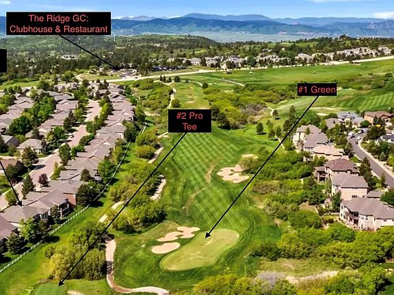 Welcome to the peaceful Bristle Cone community The Ridge at Castle Pines North on the golf course! Enjoy open concept living space full of natural light, wonderful high ceilings, and gorgeous hardwood floors. A generous living room features a fire place and amazing views. A wonderful eat-in kitchen complete with granite countertops, all appliances, and breakfast bar! An additional dining room provides plenty of space for hosting! Nearly every room overlooks the first green and the tees for hole #2. The expansive deck with awning is brand new with staircase to the lower patio! Escape to your first floor primary suite complete with 5 piece bathroom and massive walk-in closet. Additional main floor guest bedroom, bath, and study give you flexible space for guests and home office. A large main floor laundry. A fully finished walkout basement features amazing views, a game room with included pool table and sliding doors out to the lower patio! There is also an additional generous bedroom and bath, a large second Hvac room/work space with washer/dryer hookups. Location is everything with local open space, trails, Daniel’s park, shopping centers (Park Meadows and outlets), and fast access to I-25! Southern facing driveway means snow melts quickly in the Colorado sun. Top it all off with the HOA which has lawn care and DRIVEWAY snow removal: perfectly low maintenance! Do not miss your chance to see this spectacular house and make it your home!