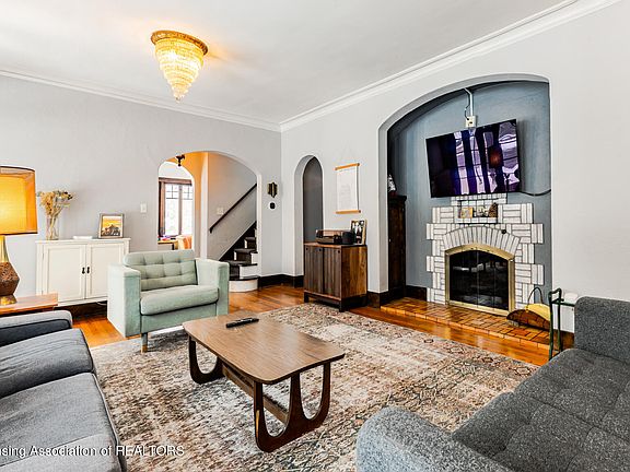 An incredible opportunity! This full brick 3bed/1.5bath home is located in the heart of the Chesterfield Hills neighborhood and is filled with Craftsman era character! Step inside the foyer to gleaming hardwood floors & wood detailing. To the left, a beautiful den radiant with natural light. To the right, a show-stopper living room complete with tile-detailed fireplace, antique light fixtures & a wall of French doors opening up to a patio, perfect for entertaining! Natural light floods the dining room! The inviting kitchen features a stained glass window, tiled backsplash, & stainless steel appliances. A 1/2 bath & quaint office-area finish off the main floor. A stately staircase draws you upstairs to find an expansive primary bedroom with dual closets, two additional generously-sized bedrooms & a full bathroom finish off the upstairs. Newly installed central A/C with two air handler units for zoned comfort! Exterior drain tile and grading.