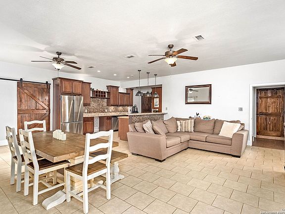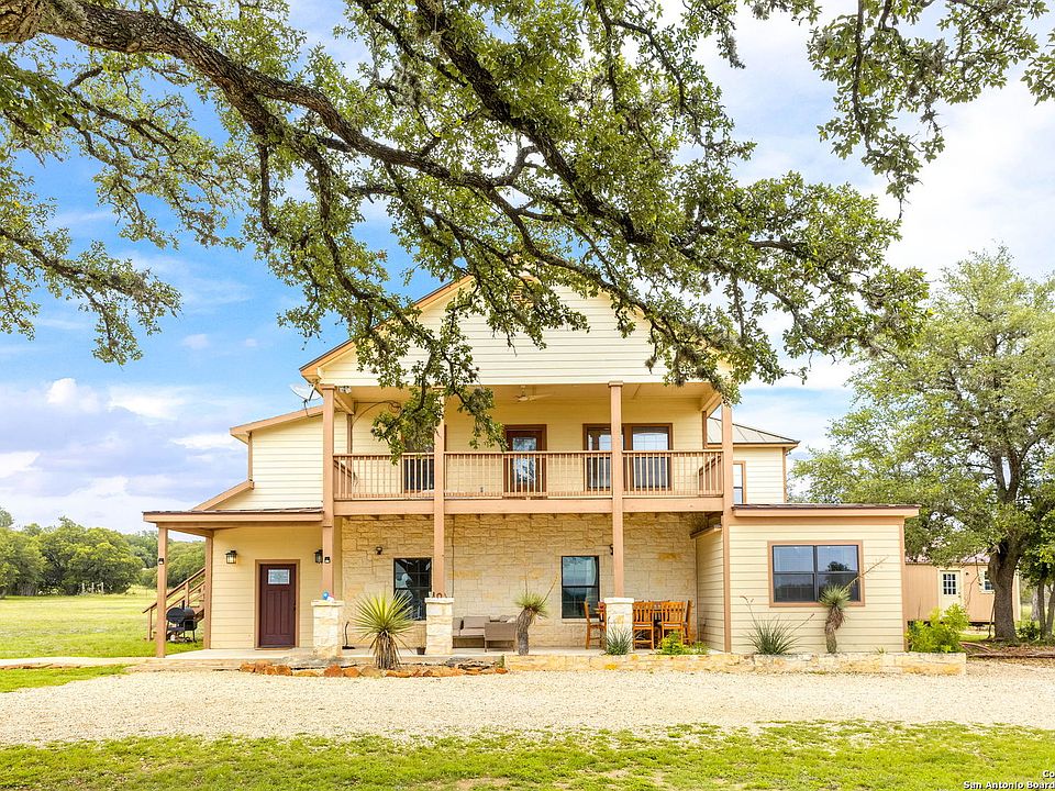 Looking for a piece of the Texas Hill Country? Here's nearly 6 acres with no HOA! Be welcomed the moment you drive in the beautiful iron gate all the way up to the Ranch style home. The light and bright wide open floor plan offers tile floors throughout, and a huge walk-in pantry. 3 bedrooms are upstairs and feature a large master suite with dual sinks and huge walk-in closet. The newly added 4th bedroom is on the primary level and could be used as the master. Enjoy amazing views of the utopia hills from the large balcony and the covered porch. This gem also includes a livestock barn for your horses or animals, pond/stock tank, fenced garden area, fenced chicken coop, and a 650 squared foot guest house. Come and check out this one of a kind property!