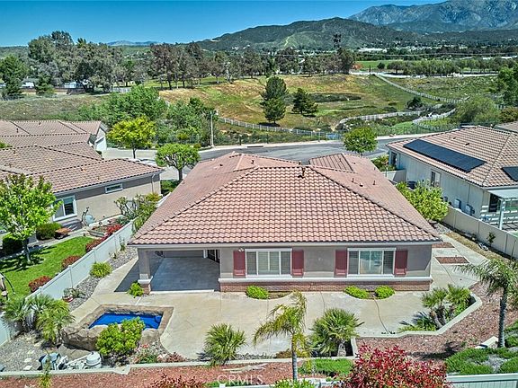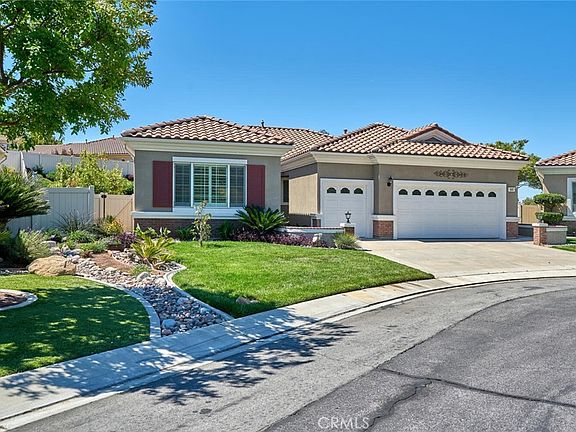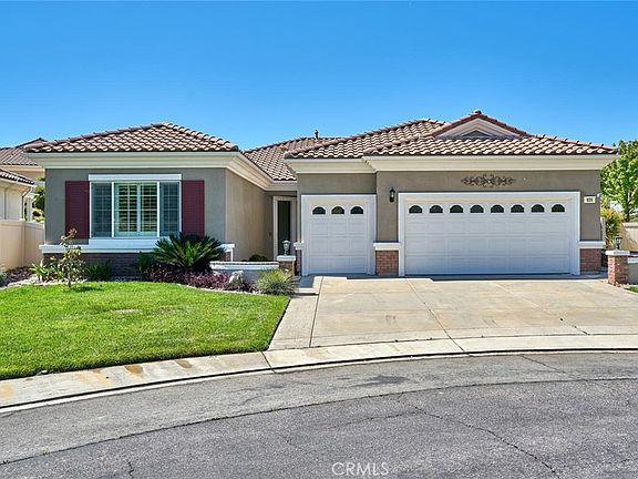 Bright and beautiful Emerald model home in the 55+ community of Solera. This home is situated on a cul-de-sac facing north with spectacular mountain views. This home has everything you want, with granite counter tops, upgraded kitchen cabinets, water purifier under kitchen sink, plantation shutters throughout, crown molding, and gas start fireplace. Back yard is beautifully landscaped and has a waterfall spa. Solera is a guard gated community with many activities and groups at the clubhouse. The Solera clubhouse has an indoor walking track, gym/fitness center, tennis courts, pool/spa, library, bocce ball court, banquet/meeting/card rooms and pool tables. The community is just off the 10 freeway with short drives to Cabazon outlet shopping, Morongo Casino, golf courses, Palm Springs, Redlands and the scenic mountain town of Oak Glen.