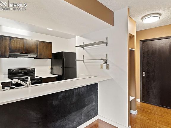 Unique condo in Southwest Colorado Springs with tons of amenities and mountain views! Enjoy the life at Skyway Condos, complete with swimming pool, hot tub and dry sauna. Plus, unit 125 is unique with laundry hookups and a stackable washer/dryer in the unit. You'll also find modern black appliances in the kitchen, new vinyl windows, freshly cleaned vents with HVAC air scrubber installed, and no carpet. Unit is equipped with A/C and HOA dues include many of the utilities. Flooring throughout is combination of hardwood, LVP, and tile flooring in this 2 bed, 2 bath condominium. With 2 floors and entry doors on each level, you can easily separate entertaining space and bedrooms in the 1012 square feet. You don't have to go far to explore everything that Colorado Springs offers, with easy access to trails and open space, dining and shopping, and unique experiences like Cheyenne Mountain Zoo or Broadmoor Hotel just around the corner. Rest assured you'll have parking when you return, with an assigned space and guest parking throughout! Don't miss your chance to capture this opportunity!