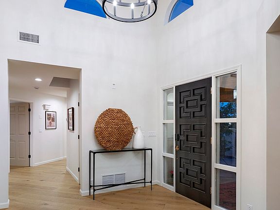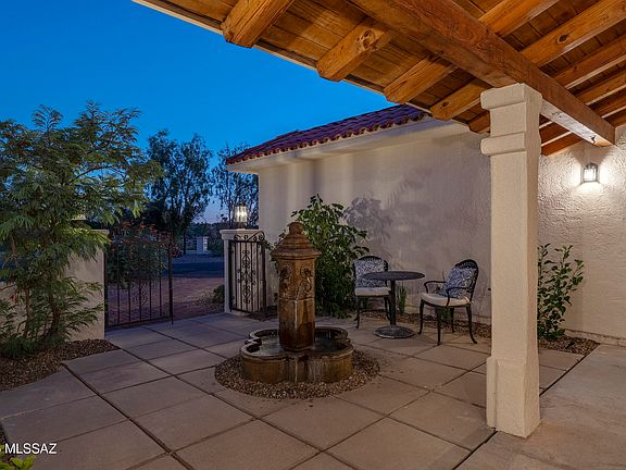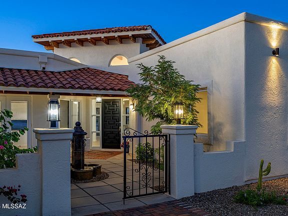 Perched atop one of the highest points in Oro Valley Country Club Estates, this exceptional 4 bedroom, 3 bathroom residence occupies nearly an acre of elevated privacy. From every vantage, unobstructed panoramas stretch across the Catalina and Tortolita mountain ranges, the rolling emerald fairways below, and the valley lights beyond. A thoughtful entry sequence sets the tone, with a gated courtyard and central water feature framing the approach and establishing a sense of presence and calm. Inside, soaring ceilings and clerestory windows fill the home with natural light, guiding the eye through a thoughtful progression of living spaces. White oak floors flow throughout, providing warmth and continuity, while vaulted living and dining rooms with exposed beams open seamlessly to the rear veranda. Custom "Pinky's" iron doors connect the great room to the outdoor terrace, offering effortless indoor-outdoor flow and framing the sweeping desert and mountain vistas. The great room and dining areas balance generous scale with refined proportion, creating spaces equally suited for intimate gatherings or formal entertaining.