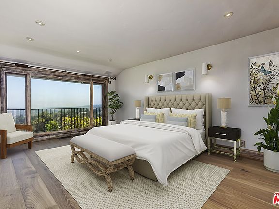 Gothic-Inspired home with Panoramic Views in Prime BHPO. Set high above the city in a peaceful & private enclave of Beverly Hills Post Office, this striking 3 bed + 3.5 bath + bonus room home blends dramatic Gothic-inspired architecture with modern luxury. Designed by a celebrity designer, the residence showcases custom wood detailing & breathtaking 180 views of the city skyline, ocean & canyons from every room. The expansive living room with soaring beamed ceilings is filled with natural light, featuring a stunning stone fireplace, oversized windows framing Downtown LA, & seamless flow into the dining area & out to an entertainer's dream deck. Spanning almost the entire length of the home, the deck offers unobstructed panoramic views & is ideal indoor/outdoor living. The chef's kitchen includes high-end stainless-steel appliances, tons of cabinetry, stylish tile flooring, & a bay window with hillside vistas. A convenient door opens directly to the deck perfect for morning coffee or al fresco dining. The primary suite is a true retreat, with a full wall of windows showcasing sweeping city & hill views, a massive walk-in dressing room with custom built-ins, & an additional wall of closets, ideal for the fashion-forward tenant. The spa-like en-suite bath is beautifully renovated, featuring double sinks, intricate tilework, a soaking tub inside the shower, & a bay window overlooking the treetops & skyline. The main level also includes a light-filled 2nd bedroom with built-ins, a fully renovated hall bathroom with skylight, & a chic powder room. Downstairs offers the 3rd bedroom en-suite with updated bathroom, a bonus room for a home office or creative space, a laundry room, & the direct access garage, complete with abundant storage & rubberized flooring, should you want to use it as a home gym. Surrounded by prestigious estate properties, this one-of-a-kind residence offers privacy, incomparable design, & effortless access to the best of Beverly Hills, the Valley, West Hollywood & the Westside. Some photos have been virtually staged.