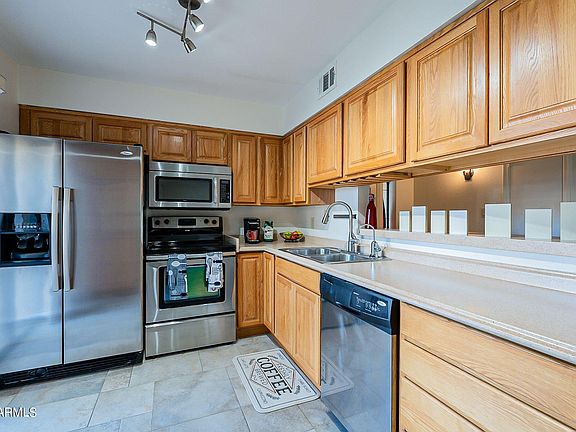 Excellent ground floor condo that backs to a greenbelt and community pool/spa* Enjoy the spacious Great Room floorplan that's open to the kitchen with tile flooring throughout* The kitchen features stainless steel appliances, a pantry w/slide out drawers and breakfast bar* New kitchen countertops installed in Aug 2022* Also access to a front porch patio off the kitchen* The spacious master bedroom offers a large mirrored closet and a private exit to the back patio* There are dual vanities in the master bath* This beautiful complex in McCormick Ranch features heated community pools and spas, tennis courts, and large open greenbelt areas.
