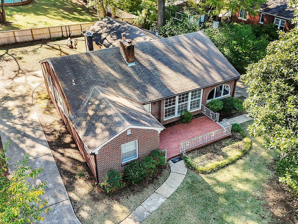Exterior highlights include a classic 1940s front terrace with decorative railing, concrete drive that wraps to a covered porte cochere with rear entry, built-in storage room, pull-down floored attic, and a concrete patio overlooking a spacious backyard with mature trees.