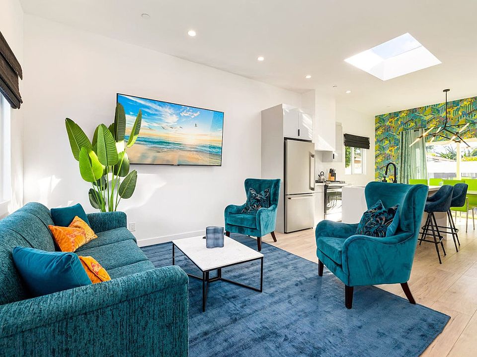 Savor your morning coffee in the secluded backyard, unwind in the private hot tub, and revel in luxury at one of LA's chic, newly built gems. The space is flooded with natural light, or you can opt for blackout curtains for serene sleep. With funky furnishings, a well-stocked kitchen, and a vibe marrying style with comfort, this home accommodates up to 8 guests. Conveniently located near all of LA's premier attractions, this house features 2 bedrooms, 2 bathrooms, and a sofa with a pull-out queen bed, comfortably sleeping a small family or group of 8. The house is newly built with stainless steel appliances that invite you to prepare a home-cooked meal. Chic decor encapsulates an upscale LA vibe, and a private backyard is perfect for relaxing in the hot tub or soaking in the SoCal sun. It includes central air conditioning and heating controlled by Nest, a brand new washer and dryer in-unit, and a fully equipped kitchen with brand new stainless steel appliances, including a fridge, microwave, gas stove, oven, coffee maker, and dishwasher. Cookware, dishes, cups, and utensils are included. You'll have access to the entire home and private backyard with a private jacuzzi and one parking spot in the gated driveway. Nestled in a centrally located neighborhood, this home offers convenient access to the most iconic sites in the City of Angels, including Downtown, Mid-City, Beverly Hills, Hollywood, Santa Monica Pier, Venice Beach, Crypto Arena, Dodgers Stadium, Bank of California Stadium, Sofi Stadium, Universal Studios, Rodeo Drive, Griffith Park Observatory, USC, UCLA, LACMA, The Broad, Disney Concert Hall, and the Hollywood Walk of Fame. The property features a Ring doorbell camera set up next to the front door, positioned to face the driveway to ensure your safety and privacy. Keyless entry allows for convenient check-in and check-out.