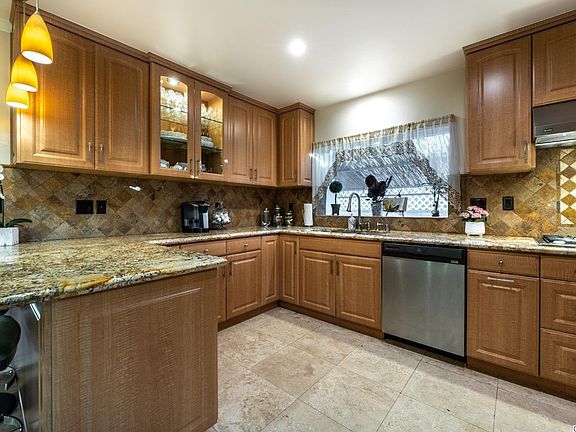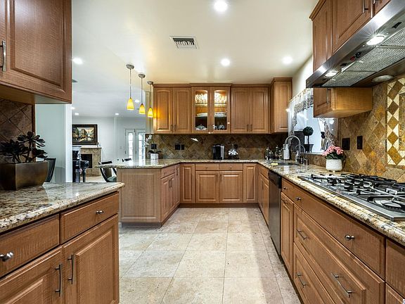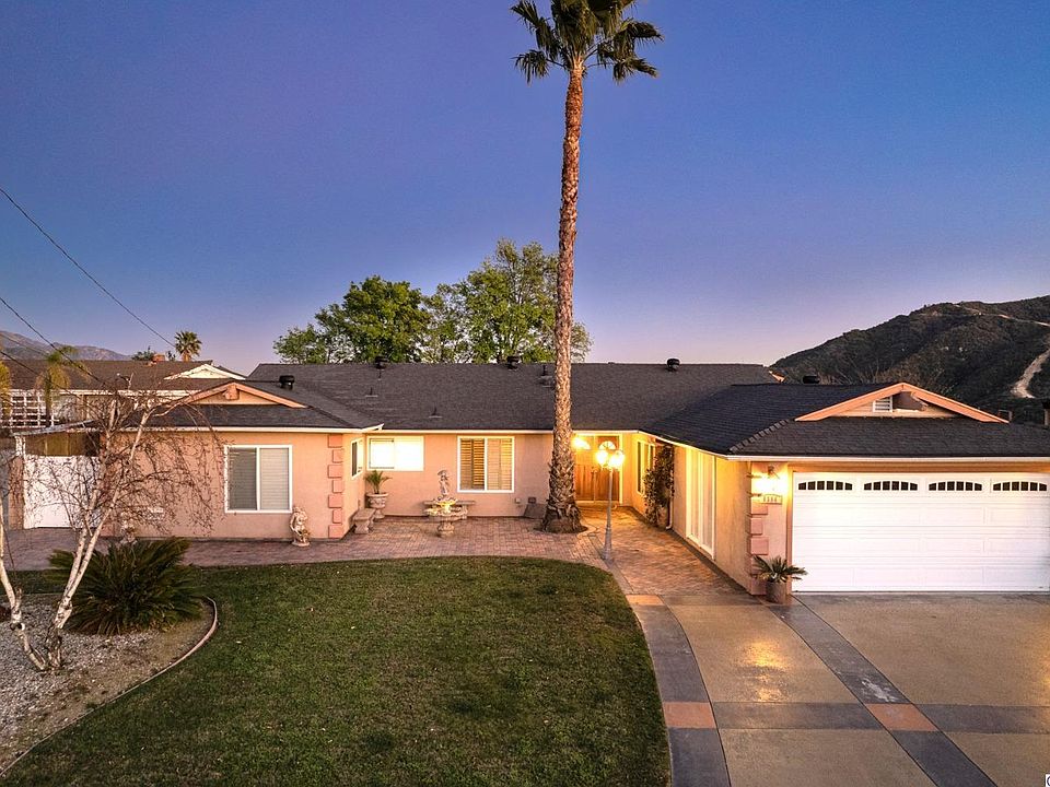 Welcome to this wonderful home in one of the most desirable neighborhoods in Tujunga. Enter through the double doors to this open floor 5 bedroom home featuring a large kitchen with granite counters, stainless steel cooktop, double oven and dishwasher. Kitchen also features a breakfast counter with cabinets and opens to a breakfast nook, family room, formal living with fireplace, and dining room. Hallway separates the bedrooms including the master suite with double Vanities, an en-suite bedroom and three additional bedrooms with plantation shutters and recessed lighting. French doors from the master suite open to the backyard. Walk out the French doors from the living area to the oasis-like backyard with grassy yard and pebble tech pool with Pentair lights. Entertain your family and friends on the patio and enjoy beautiful sunset views through the glass fence overlooking the canyon. Other features worth mentioning are the large two-car garage, dual pane windows and doors, central A/C and heat, recessed lights, surround sound and much more.