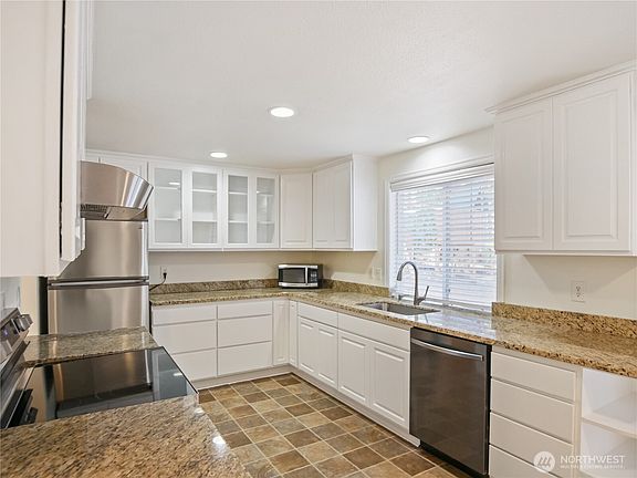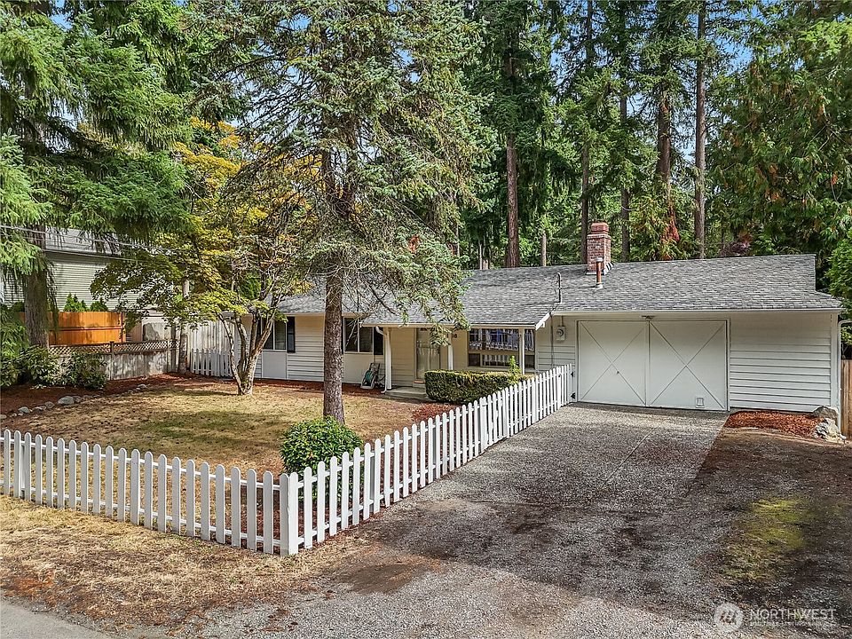 An open, light-filled Stunning 3/4BR,2BA Rambler w/Beach Rights. Brightening freshly painted interiors. Featuring a cozy living room w/wood fireplace. The light-filled kitchen with granite countertops and stainless-steel appliances, while the adjoining dining area opens through French doors to a private patio. The versatile office can double as a fourth bedroom, and the convenient laundry room adds practicality. The primary suite includes a full bath, and two additional bedrooms share a second full bath. Enjoy a fully fenced backyard with large patio invites outdoor gatherings and quiet evenings under the stars. Move in Ready! A storage shed! Close to Lake WA schools, I-520, Microsoft & Costco.