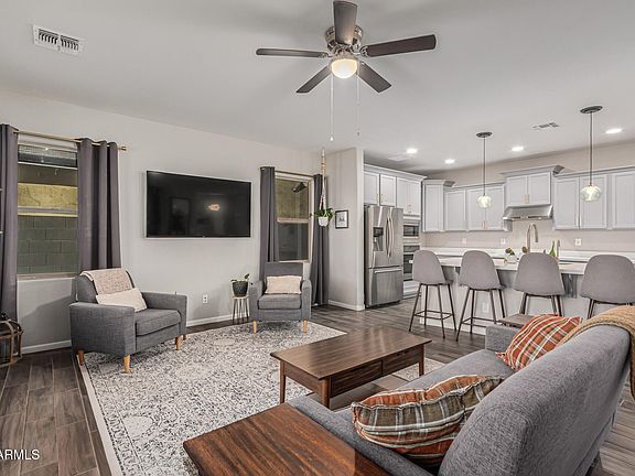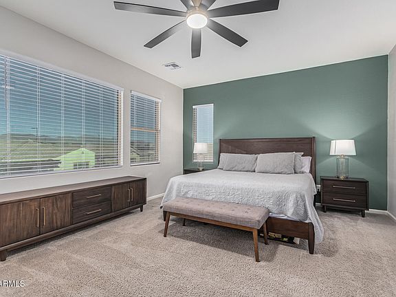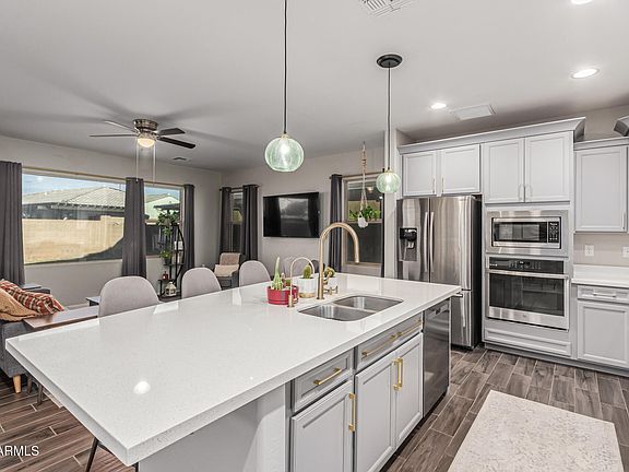 Contemporary, newer home in desirable Blue Horizons community! Modern upgrades include: Shimmering white quartz countertops,oversized island seating,vibrant brass fixtures/finishes,sleek lighting & fans,gourmet style kitchen w/in-cabinet ovens & separate cooktop, 42'' gray upper cabinets w/ 4'' crown molding & brass pulls,stainless appliances inc fridge,warm wood-look tile on main floor & wet areas,upgraded wrought-iron stair rail,green backyard w/NO 2 stories behind, 2 car garage & added storage area. SEE FLOORPLAN-Spacious rooms inc a GRAND Greatroom w/gorgeous Kitchen, large separate Dining Rm + Guest Bdrm w/walk-in closet & Full Bath on the main floor. Ample upper floor has open Loft,2 Guest Bdrms w/Full Bath,Laundry up,& Primary Ste featuring private Bath w/dbl sinks & walkin closet! -Blue Horizons community offers various lush, neighborhood parks, ramadas, a sand volleyball court, a soccer field, basketball courts, a baseball field, and miles of walking trails.