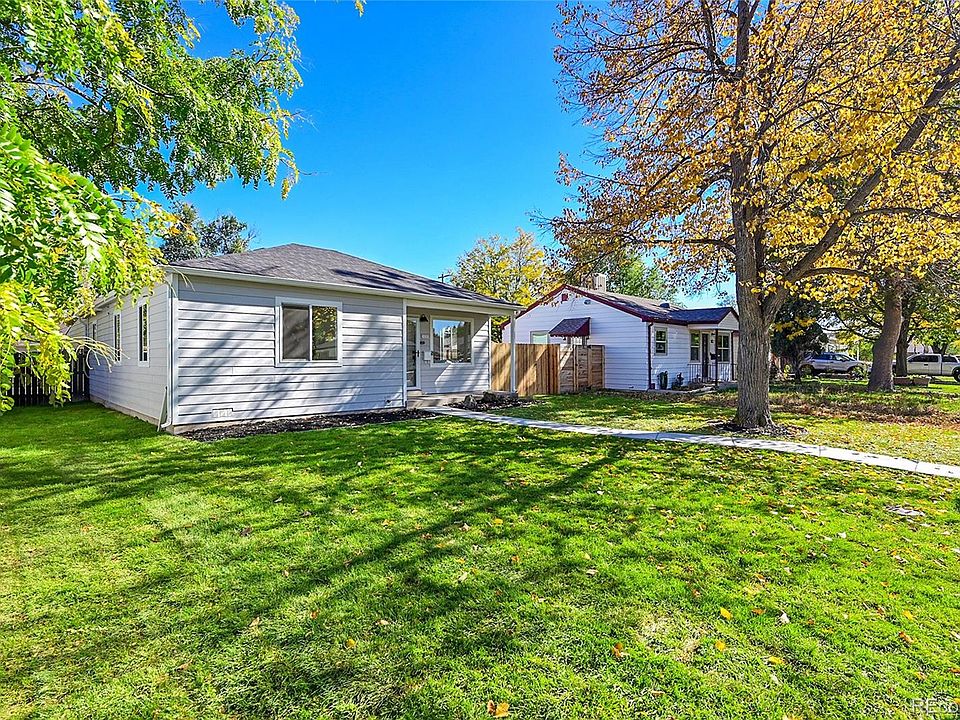 Professionally designed, fully renovated and centrally located less than 10 mins from downtown Denver! With excellent curb appeal, new exterior paint, windows, front door, concrete walkway and landscaping, you'll be instantly impressed. Beautiful refinished hardwood flooring leads you into a brand new, open-concept kitchen featuring white shaker cabinetry, slab quartz countertops, designer tiled backsplash, high-end white Bespoke appliances, new hardware and faucet. Primary suite offers plush new carpet and a fully remodeled 3/4 bathroom with penny tiled floor, luxurious shower, new vanity, mirror and lighting. Two additional bedrooms with hardwood flooring, and a fully renovated full bathroom with new tile, bathtub, vanity, shower valve, vanity and mirror. Darling and functional laundry/mud room adds pantry and storage space with built-in white shaker cabinetry. The gorgeous backyard offers plenty of parking options including space for an RV, covered carport and large gravel lot with sliding gate. New fence, sod and fire pit, perfect for chilly winter nights and entertaining. Additional storage space on the side of the carport. This home has all new paint, doors, lighting, windows, furnace, water heater and central AC! Schedule your showing before it's too late.