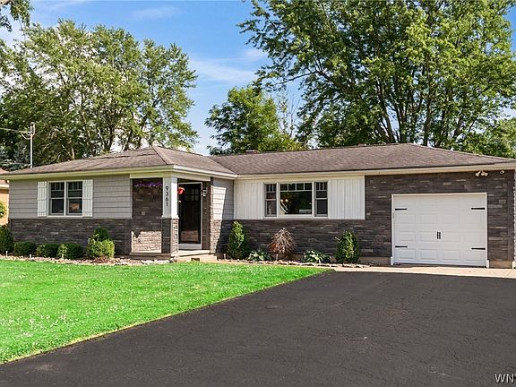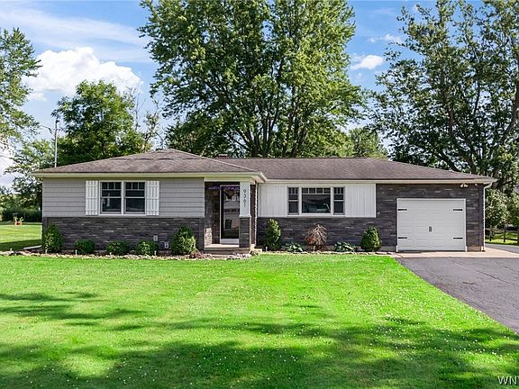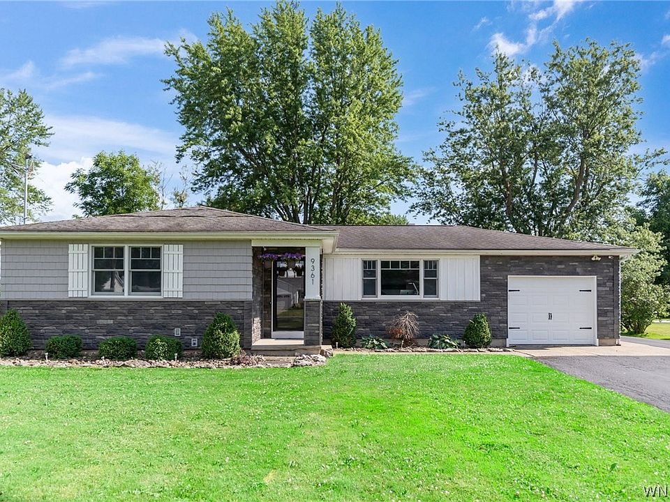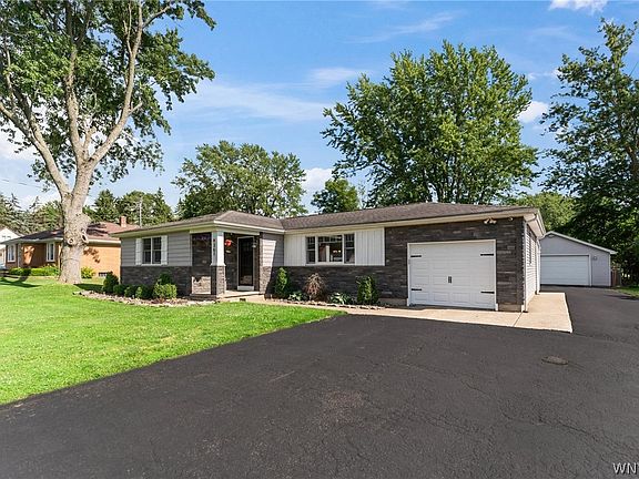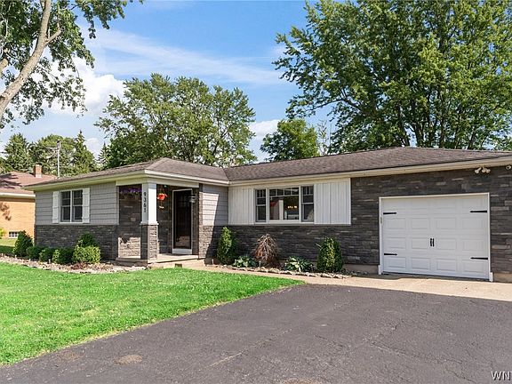Welcome to this completely updated 3 bed, 2 bath ranch in highly desirable Clarence Center. Mins away from Clarence Park, bike path, and library! Attached tandem garage plus additional 3 car garage. The kitchen was updated in 2023 with brand new SS energy efficient appliances, bright quartz countertops, subway tile backsplash, breakfast bar, and deep double sink. Off the kitchen & dining area is the family room, with the open concept feel perfect for entertaining. Cozy up with its gorgeous vaulted ceilings, new carpeting, & wood-burning fireplace. Sliding glass doors lead you out to the concrete patio & large private backyard with country views. Gleaming hardwood floors take you to the living room and all 3 bedrooms. Recently updated bath, with shiplap walls, matte gray tiling, and rainfall shower. Not included in the total sq ftge is the finished bsmt, currently used as 1/2 home gym, 1/2 media room. Other updates include- new vinyl siding, HE furnace & A/C, led lighting, attic insulation, 2nd sump pump, windows, electric, and architectural roof. Open Houses 7/31, 8/3, 8/4. Negotiations begin on 8/6 at 3. Not included with sale: sauna, gym mats, playset, sandbox, bdrm fireplace.