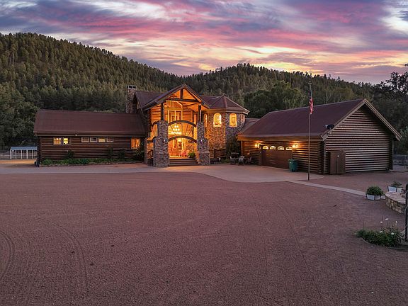 This exquisite custom log home is truly one-of-a-kind. The entry welcomes you with wagon wheel accents, opening into a grand great room with soaring 30-foot cathedral ceilings and a Juliet balcony from the upstairs bedroom. Knotty pine ceilings, pine floors, and striking log posts and beams set the tone for a rustic yet elegant retreat. The expansive dining room, highlighted by a dramatic chandelier, showcases the home's scale and beauty. A chef's dream kitchen awaits with custom cabinetry topped with granite counter tops, copper farmhouse sink, Samsung gas range, stainless commercial refrigerator/freezer, ice maker, and warming drawer, along with a large walk-in pantry. The primary suite features vaulted ceilings, a cozy wood stove, and a spa-inspired bath with clawfoot tub, steam shower, dual granite vanities, bidet, and an impressive walk-in closet with custom wood shelving and drawers. This home blends timeless craftsmanship with luxury living, offering an unparalleled mountain lodge experience.