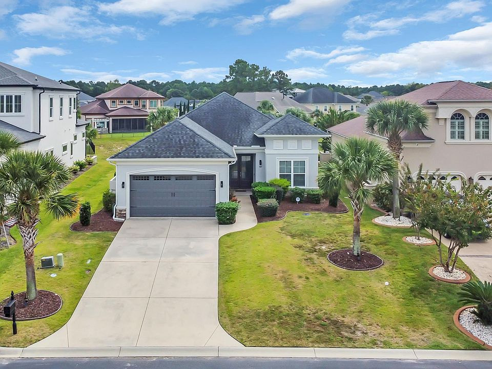 Four bedroom Mediterranean ranch with a three car garage and a tranquil pond view in The Bluffs on the Waterway, a gated community known for first class amenities including two elegant clubhouses, a resort style pool, private boat launch and day docks, boat and RV storage, tennis and pickleball, playground, and walking trails just minutes from the beach. This amenity rich lifestyle sets the tone the moment you arrive, promising everyday relaxation and effortless entertaining. Inside, the open concept great room flows into a chef’s kitchen with granite countertops, stainless appliances, and a tile backsplash, while wide plank flooring, plantation shutters, custom lighting, and crown molding elevate every space. The owner’s suite pampers with a walk in shower and dual vanities, and a flexible office or bonus room offers abundant storage. Ideally located near Carolina Forest golf, shopping, dining, medical services, and the airport, this home is move in ready—bring your boat and start living the Waterway dream.Move in ready and golf cart friendly, so bring your boat and start living the Waterway dream!