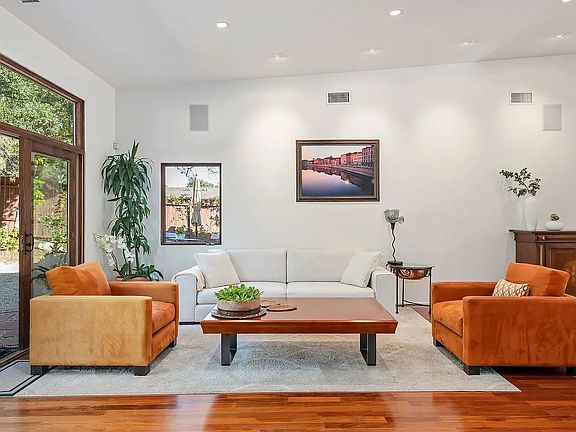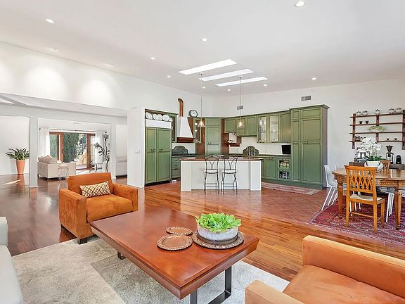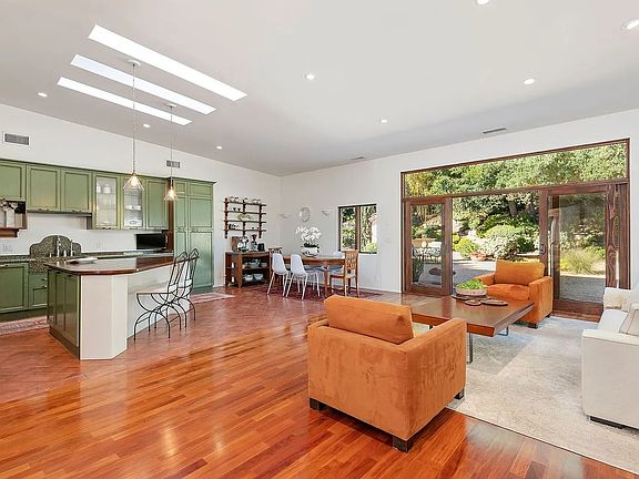 The 4-bedroom, 3.5-bath home is configured with two master bedrooms, both with en suite baths with jetted Jacuzzi tubs and walk-in closets, a home theater, and a home office which has direct access to the outdoor courtyard. The grounds include multiple sitting areas, a wood-burning pizza oven, a waterfall, a courtyard, vegetable gardens and a terrace.