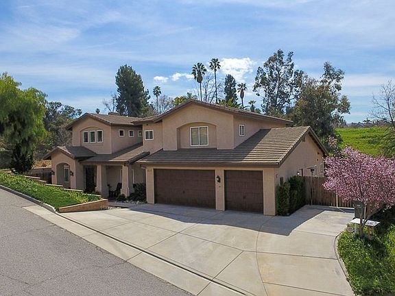 Beautiful, newer 4 bed, 3.5 bath home with two masters-(one on the first level) both with ensuite bathrooms in the hills of S. Redlands. The kitchen has lovely wood cabinets, stainless appliances and granite counters, both the kitchen and family room look onto the private rear yard. Adjacent to the kitchen is the large dining area. The front room which is currently used as an office shares a double sided fireplace with the spacious light filled family room, both have beautiful bamboo wood flooring. The first master bedroom sits at the rear of the home and has bamboo flooring, a huge walk in closet and a large ensuite retreat style bathroom with dual sinks, jacuzzi tub and a separate shower. There is also a very large laundry room with sink and storage and a half bath. Upstairs is the second master with a ensuite bathroom and two other good size bedrooms with a Jack and Jill bathroom. The rear yard has 2 patios, a built in BBQ area, a large lawn looking onto the hills and Orange and Lemon trees. The home has a 3 car garage with lots of storage and exterior parking space for your boat or ATV. There is dual AC-upstairs/downstairs (and the downstairs master can be controlled separately). There are fans in all the bedrooms, a whole house fan, an alarm system, gutters, automatic sprinklers and a storage shed. Both fridges and the washer/dryer will stay with the home. Come take a look, you will love this fabulous home!