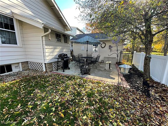 Enjoy outdoor living on the private back patio surrounded by mature landscaping—perfect for relaxing or entertaining. The covered front porch adds curb appeal and a welcoming entry. A long concrete driveway leads to a detached one-car garage for off-street parking.