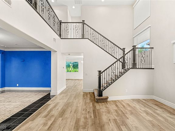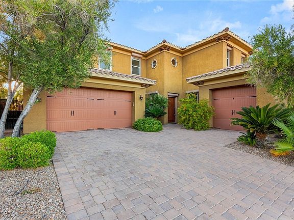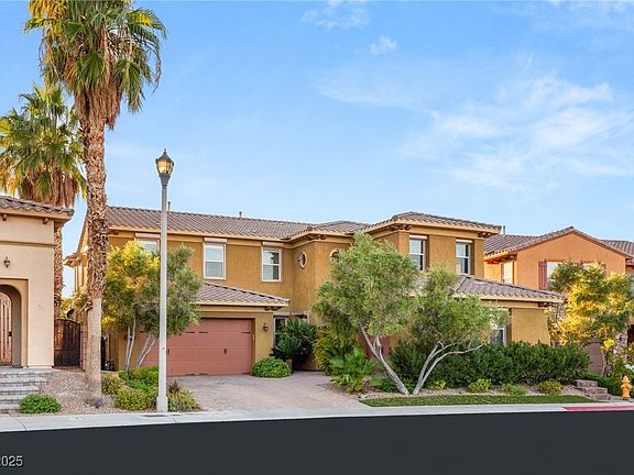 This European-inspired, former model home sits on a premium golf course lot in the guard-gated community of Tuscany, offering breathtaking golf course, mountain, city, and Strip views. Spanning nearly 3,800 sq. ft., this immaculate residence features 3 spacious bedrooms (with an optional 5-bedroom layout), 3 full baths, a 3-car garage, and vaulted ceilings that create. Inside, you will find custom cabinetry, a gourmet kitchen designed for both style and functionality. The downstairs den with a full bath provides a flexible space perfect for a home office or guest suite, while the loft upstairs offers additional living or entertaining options. From the dramatic staircase with wrought-iron railings to the thoughtfully upgraded finishes throughout, every detail exudes elegance and craftsmanship. Enjoy the stunning views from your backyard oasis. Residents of Tuscany Village enjoy world-class amenities. This home truly has it all!