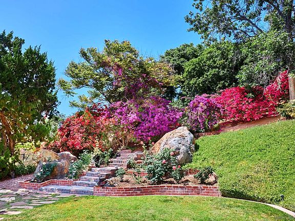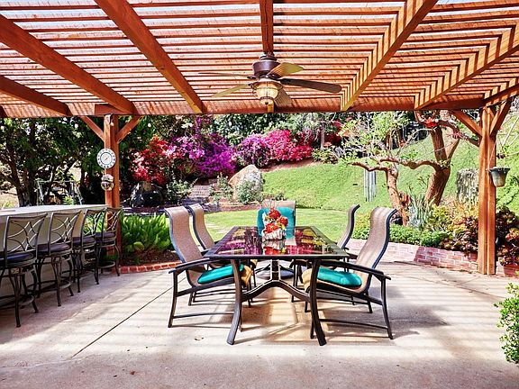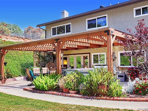 Offering lovely curb appeal, this Mount Helix turnkey beauty, perched on a bluff looking over the neighborhood, features panoramic views, Garden of Eden backyard with outdoor kitchen under trellis patio, complete privacy and room for a pool. Indoors enjoy formal living room, dining, handsome den with stone fireplace & wet bar & spacious kitchen. All bedrooms upstairs with 4th bedroom converted to airy loft office. Quiet, stately street of beautiful homes and no-thru traffic cul-de-sac. Paid solar!Beautiful wood floors and shutters, remodeled kitchen/bathrooms, Andersen French doors in family room to backyard patio, new driveway with pavers, rain gutters, backyard shed, outdoor trellis patio with grill and counter.
