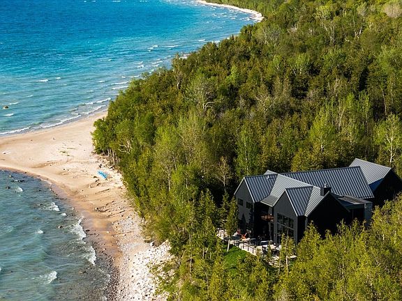 Every so often, a home comes along that’s truly unforgettable. 9371 Onominese Trail is that rare opportunity - a once-in-a-lifetime lakefront estate with over 500 feet of private Lake Michigan shoreline, 6,000+ square feet of inspired living space, and a setting so breathtaking, it feels dreamlike. Set on 3 secluded, wooded acres, this west-facing property offers front-row views of spectacular sunsets and an abundance of natural light throughout the day. At the heart of the home is a chef-inspired main kitchen, complemented by a secondary catering kitchen for entertaining and everyday ease. The primary suite is a true retreat, complete with a spa-like en suite featuring a steam shower, elegant finishes, and tranquil views. Upstairs offers a luxurious guest suite, state-of-the-art media room, and private sauna - an ideal blend of relaxation and recreation. While the current layout includes two bedrooms, the media room’s size and versatility offer potential for a three- or even four-bedroom configuration. Remarkably energy-efficient, the home’s advanced geothermal system provides consistent year-round comfort with minimal environmental impact. Additional highlights include a dedicated art studio, sustainable design elements, and curated finishes that reflect modern sophistication and timeless style. Whether you’re enjoying a quiet moment by the water, creating in the studio, or unwinding in the sauna, this home offers an extraordinary lifestyle shaped by comfort, creativity, and nature. With unmatched privacy, craftsmanship, and one of Lake Michigan’s most stunning shorelines, 9371 Onominese Trail is more than a residence - it’s an experience. The offering includes two parcels: one with the custom home, and the other a vacant, buildable lot - adding versatility, value, and future potential.