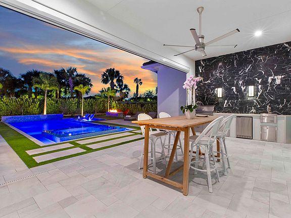 Expansive windowsCustom poolCustom-built summer kitchenSleek quartz countertopsSpa-like bathroomLush tropical landscapingOpen-concept layout