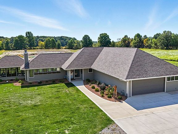 Open House 10/5 4-6pm. Welcome to this beautifully maintained 3-bedroom, 2-bath ranch offering 2,100 sq. ft. of comfort and charm, perfectly nestled on 8 acres of scenic land. Step inside and enjoy the spacious open layout, highlighted by a large enclosed porch with Eye- Breeze windows—perfect for relaxing year-round.The outdoor oasis is ideal for entertaining or unwinding, featuring a covered patio with fire pit and tranquil views of the pond and surrounding countryside.Out front, 4 acres are currently cleared for trails but offer endless possibilities—whether farming, gardening, or future crops. The attached heated 3-car garage comes equipped with an EV 240 outlet, offering both convenience and efficiency.This property blends modern comfort with serene country living—don’t miss your chance to own your slice of paradise