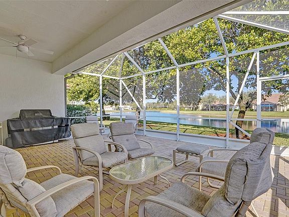 Step into this Bright & Beautiful wide open & well maintained 3 bedroom 2 bathroom 2 car garage waterfront home in the highly desirable guard gated Community of Baywinds. Freshly painted & ready for new owner. Master bedroom is large & has a custom finished closet. Laminate flooring in 2 of the bedrooms. 3rd bedroom serves as an office with built ins but has a closet. Large neutral tile throughout the living area. Large kitchen with lots of counter space & cabinets. Large screened in patio over looking for serene lake views. Accordian shutters for the windows. Community boasts beautiful clubhouse, 2 pools, tennis courts, pickle ball courts and many more activities. Close to shopping & highways.