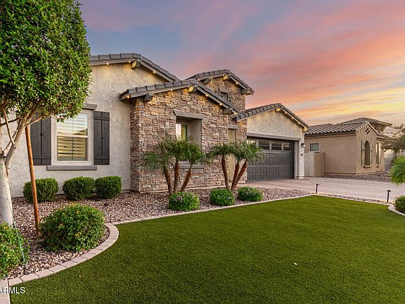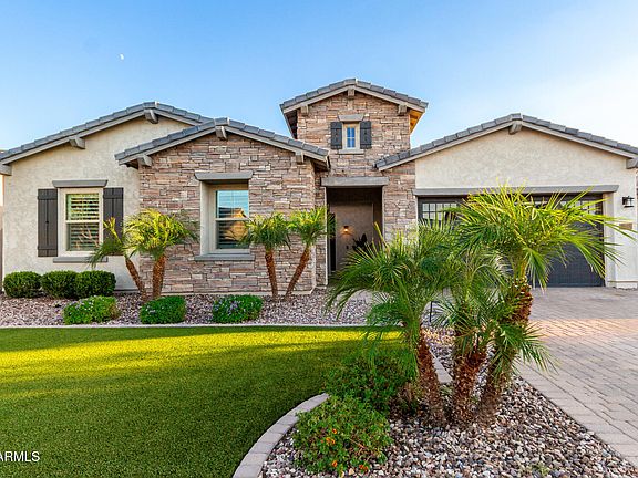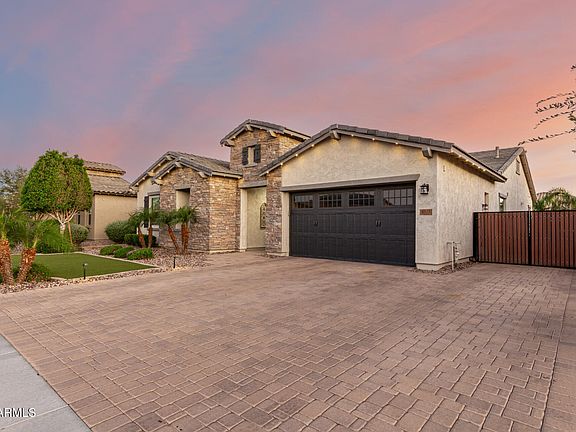 This immaculate, model-like single level in The Meadows impresses with stunning curb appeal, a tandem 3-car garage, and RV gate. Inside, soaring 12-ft ceilings frame the expansive great room plus chef's kitchen with granite counters, extended cabinetry w/ crown molding trim, & large island w/ breakfast bar. A versatile den offers the option for a formal dining, home office, or flex space. Thoughtful upgrades include custom paint, designer lighting, surround sound, plantation shutters and more throughout. Step out back to experience outdoor living at its finest—highlighted by a stylish pergola, built-in grill, and ample space to entertain or relax. This home combines thoughtful design, comfort, and functionality in one of the community's most desirable locations! Backyard oasis boasts covered patio, synthetic grass, palm trees, & Ramada w/built-in BBQ & cozy fire pit for gatherings year-round. Don't let this wonderful home slip by!