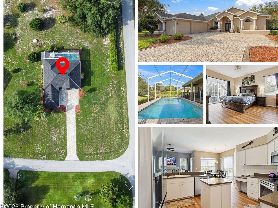NEW PRICE on an Incredible Home! Welcome to 9376 Bearwalk Path, an exceptional pool home nestled in the highly desirable Woodland Waters community of Weeki Wachee. Set on a beautifully landscaped 1.23-acre corner lot, this three-bedroom, three-bathroom residence offers a rare blend of privacy, elegance, and updated comfort—all within one of Hernando County's most scenic neighborhoods. Woodland Waters is known for its rolling hills, oversized parcels, and tranquil, nature-inspired setting, providing residents with a peaceful retreat while still being close to everyday conveniences and the Suncoast Parkway. This thoughtfully designed home features a spacious split floor plan with updated luxury vinyl plank flooring flowing seamlessly throughout. The open-concept kitchen overlooks the living room, creating an inviting space perfect for entertaining or gathering with loved ones. Natural light pours in from large windows and glass sliders, highlighting fresh 2024 interior and exterior paint and offering serene views of the sparkling pool and surrounding greenery. The primary suite is a true retreat, complete with a large walk-in closet, pool views, and a luxurious bathroom featuring a soaking tub, dual vanities, and a separate shower. Step outside to the extended lanai and unwind in your private backyard oasis—enhanced by a newly pavered driveway and pool deck, ideal for outdoor relaxation and Florida-style entertaining. The lush lot also features mature landscaping that includes a fig tree and two loquat trees, adding to the charm, shade, and seasonal fruit you can enjoy right from your own backyard. This home has been meticulously maintained and thoughtfully upgraded with a brand-new 2025 roof, a 2017 HVAC system, and a 2023 replacement of the drain field—ensuring peace of mind for years to come. Combining modern updates with timeless design, 9376 Bearwalk Path delivers the best of Woodland Waters living, where space, style, and nature converge in perfect harmony. Schedule your showing and bring your offer, today!