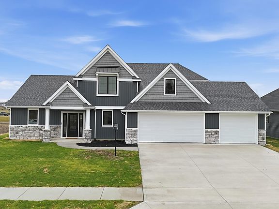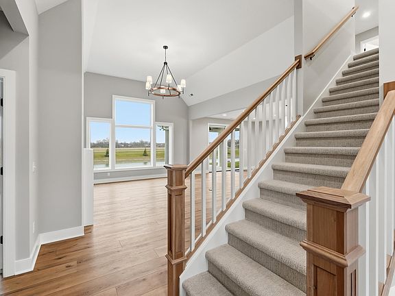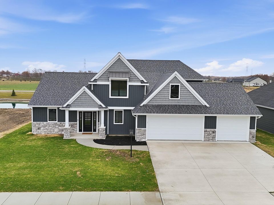 New Construction by Bob Buescher Homes |Newly Completed and ready to purchase!! Discover this exceptional two-story home in the sought-after community of Orchard Hills, designed with a refreshing coastal vibe that enhances its charm. Spanning 2,417 sq. ft. of livable space, this residence features 3 bedrooms and 2.5 bathrooms, along with a flex room on the main level and a bonus room on the upper level. Additionally, this home includes a three-car garage with 797 sq. ft. Designed for both style and practicality, this open floor plan boasts many highlights, including a beautiful water view. Upon entering the foyer, you are welcomed by an expansive great room featuring a 13-foot vaulted ceiling, anchored by an elegant gas fireplace surrounded by brick, and complemented by custom trim details on the fireplace chase. Large windows flood the space with natural light, enhancing the airy, coastal feel. The kitchen seamlessly connects to the great room and dining area, showcasing custom maple cabinetry—White Dove upper cabinets and stained lower cabinets—paired with a generous 8’x3’ island. The cabinetry and island are beautifully complemented by quartz countertops, providing a luxurious feel. New owners will appreciate the stylish backsplash that adds a touch of sophistication to the kitchen, along with a sizable walk-in pantry that ensures ample storage. Adjacent to the dining area is a flexible room that can easily serve as a home office. The primary bedroom suite, also located on the main level, features a spa-like bathroom that offers new owners a double vanity adorned with a cultured marble top, a zero-entry custom tile walk-in shower, a private water closet, and an oversized walk-in closet spanning 13 feet. Upstairs, you will find two well-sized bedrooms, a full bathroom, a bonus area for relaxation or entertaining, and direct attic access that provides convenient storage. Additional highlights of this home include LVP flooring throughout the main level, with carpet in all bedrooms, closets, on the stairs, and in the upper-level bonus room. The main-level laundry room is conveniently located near the garage entry, and there is a guest half bath on the main level, along with a covered back porch which offers a serene space to enjoy peaceful evenings. Orchard Hills presents a rare combination of tranquility and convenience, located just minutes from shopping, dining, and I-469 while surrounded by a serene rural setting.