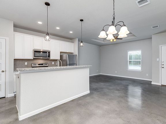 This inviting home features soaring high ceilings and an open floor plan that creates a bright, airy living space perfect for both relaxing and entertaining. Enjoy the beauty and durability of stained concrete flooring throughout, paired with modern touches like granite countertops and sleek stainless steel appliances in the kitchen. A breakfast bar and separate dining area provide flexible space for meals and gatherings.