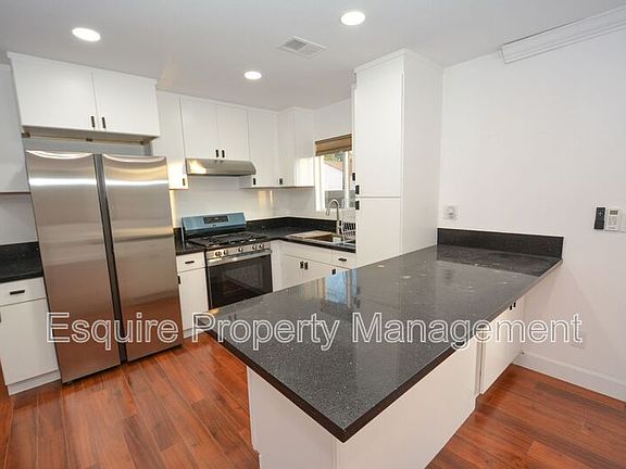 Experience this very private 2-bedroom, 1-bath ADU in this professionally designed, new build featuring high-end wood flooring throughout for a cohesive look. The new kitchen features gorgeous custom white cabinetry, sleek quartz countertops and a breakfast bar. The bedrooms were transformed with fresh paint and new flooring. The elegant shower tile extends all the way to the ceiling and features a glass enclosure. The wall behind the toilet also goes up to the ceiling, creating a stylish accent that pairs beautifully with the vanity. Other notable features include AC and heating, a laundry area with a built-in washer and dryer, designer lighting, ceiling fans, on-site parking for 2 cars, and a private entrance to the home. Enjoy your morning coffee on your light and bright private patio.
