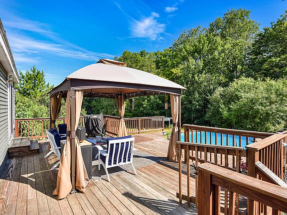 Nicely maintained home on a well landscaped lot. The new pool, the large deck, horse shoe pit and fenced in lawn area make this outside space perfect to entertain. Or you can spend your time in the garage; perfect for car enthusiast with ability to store cars or install a lift. Plenty of storage above the garage. With the pellet stove heating the garage; it would make a great woodshop/ workshop as well. The house itself has been well maintained with new on demand hot water, new washer/dryer, new dishwasher and new carpet in the downstairs family room. The vaulted ceilings make the living room spacious; the heat pump has help keep the home cool this warm summer. Must See! Chain link fence storage above the garage oversized doors