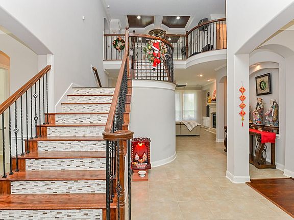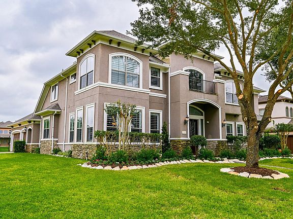 This home is located on a rare, corner lot With Lake Frontage. Oversized lot. 2 Bedroom suites! One on each floor Spacious entry with custom Double Front Doors. Owner has added custom flooring. Windows now have plantation shutters. The game room has a dramatic, custom ceiling. The main stairway has been remodeled with custom tile on the risers and beautiful wood flooring.