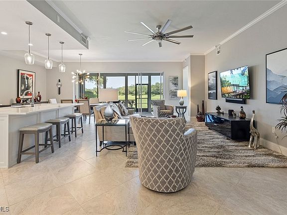 Live the dream at Renaissance Golf & Country Club! Step into a life of luxury in the highly sought-after Triana neighborhood with this stunning first-floor carriage home! Offering 2 bedrooms + den, 2 bathrooms and a spacious 2-car garage with epoxy flooring and room for your golf cart! From the moment you enter, you're greeted by soaring 12-foot ceilings, elegant crown molding and designer touches throughout. The open-concept living space flows seamlessly into the expansive screened lanai through oversized sliding glass doors, creating a true indoor/outdoor oasis with unobstructed golf course views. The kitchen is the heart of the home, showcasing custom cabinetry, sleek quartz countertops, premium stainless steel appliances, a spacious wet bar and a reverse osmosis system for crisp, filtered drinking water. The luxurious primary suite is a peaceful retreat with tray ceilings, his-and-hers walk-in closets, dual vanities, a soaking tub and a spa-worthy walk-in shower. For added peace of mind, enjoy electric roll-down hurricane shutters and a brand-new A/C system installed in 2023. Feel safe and secure in this guard-gated community with 24/7 security, giving you peace of mind day and night. Renaissance is more than just a community, it's a lifestyle! Enjoy access to an Arthur Hills Championship Golf Course, resort-style pool and pavilion, full-service spa and fitness center, on-site dining, tennis, pickleball, bocce, a library, playground and so much more. All just minutes from RSW Airport, white sand beaches, upscale shopping, fine dining and endless entertainment. Don’t miss your chance to own a piece of SWFL's paradise, schedule your private showing today!