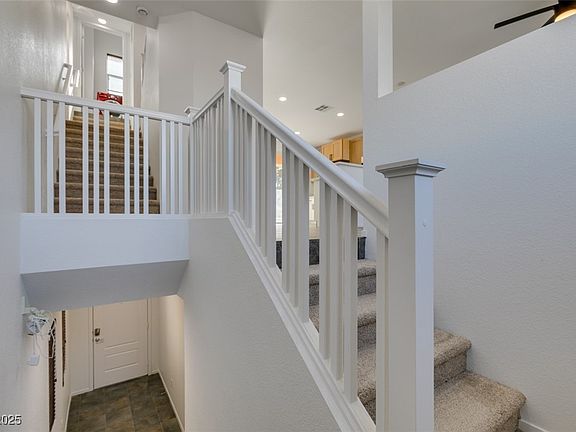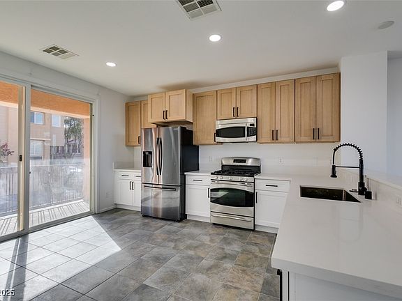 Step into this beautifully updated 3-story home, where modern comfort meets timeless style. The heart of the house features a sleek kitchen with stainless steel appliances, and durable tile flooring, all complemented by fresh paint throughout and brand-new shaker cabinets. Upstairs, the third-floor outdoor deck offers the perfect retreat to soak in sweeping mountain views—ideal for morning coffee or evening gatherings to enjoy views of the famous Las Vegas Strip. With thoughtful updates and inviting spaces, this home is ready to impress and inspire its next owner