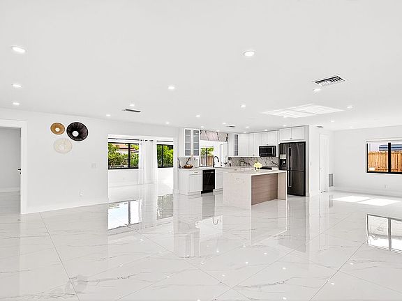 Inviting open layout that seamlessly connects the living, dining, and kitchen areas, perfect for entertaining friends or enjoying quality family time. Porcelain floor tiles throughout the home, beautiful open kitchen with wood cabinets and quartz countertops. Newly installed hurricane impact windows & doors. Adjustable LED lighting throughout the home, complete with dimmer switches to set the mood for any occasion.