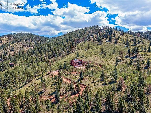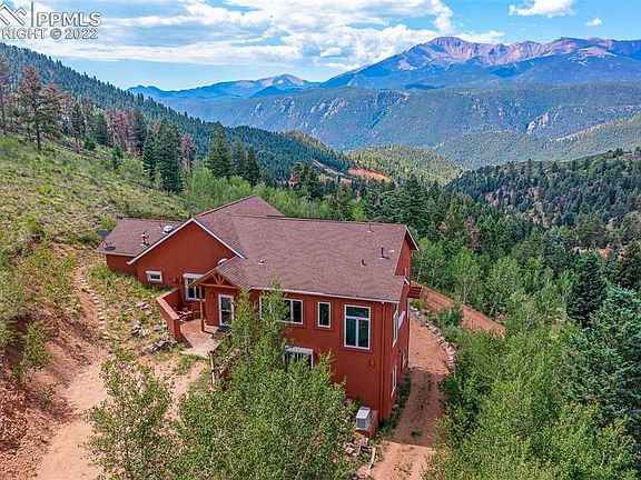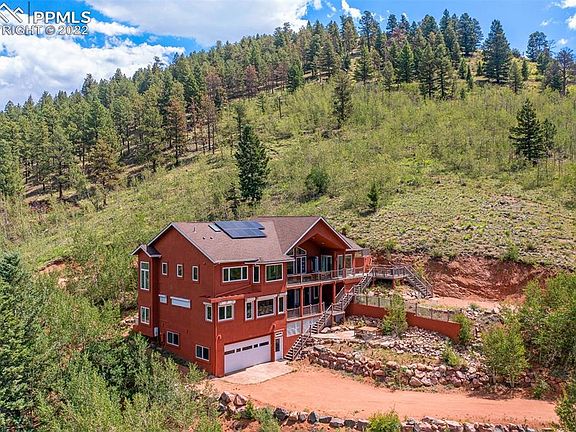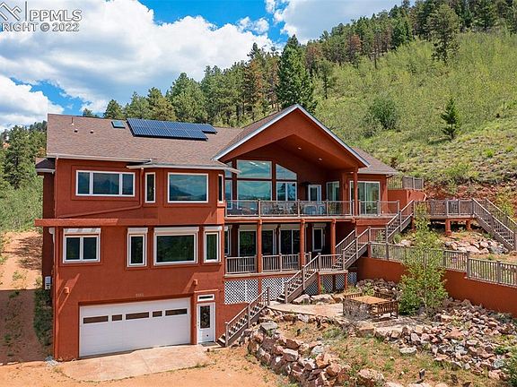 Living on top of the world! Don't miss this rare opportunity to own a home in the highly desirable gated community of Columbine Canyon! This four-bedroom/three-bathroom stunner is situated on five and a half acres that border national forest. Every bedroom has a walk-out to amazing Pike's Peak views. Upon entry, you will be treated to a great room bathed in natural light thanks to the floor-to-ceiling window and skylights. The kitchen is a cook's dream with stainless steel appliances, cherrywood cabinets, and Colorado slate tiles thorough. There is plenty of space for a quick snack in the breakfast nook or take a formal meal in the dining room. The views from the main level deck are undeniably breathtaking. A bedroom and laundry space round out the main floor. As you head downstairs you will notice the bedrooms are spaced for optimum privacy. The generously sized primary suite comes complete with its own stunning views and an en-suite five-piece bathroom. Two secondary bedrooms are located down the hall. A full bathroom with a dual sink rounds out these living quarters. The garage access is one floor below and touts 14 ft ceilings and a workshop. The space is insulated making it much more comfortable in the snowy months. The owned solar panels provide relief for the electric bill! Additional high-end touches include automatic shutters of the window, a built-in generator, and a central vacuum. A home built with no details overlooked. (HOA snow removal includes common areas)