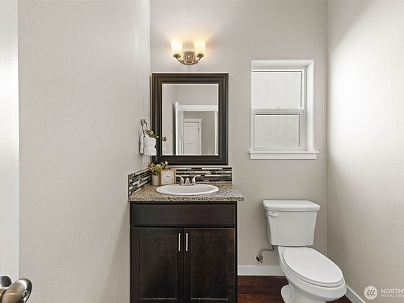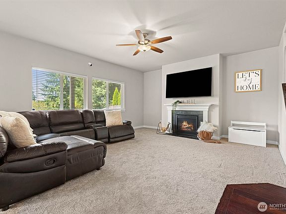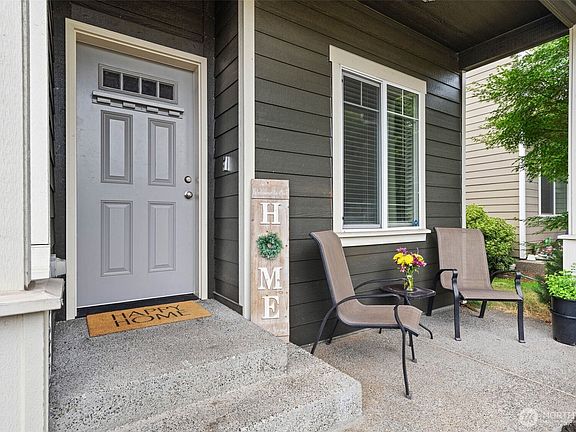 Welcome home to an inviting retreat perfect for both comfort (AC!) and entertaining! The open floor plan features a spacious island with eating bar, walk-in pantry, and SS appliances with a natural gas range for the home chef. A main-floor office/4th bedroom adds flexibility, while the upstairs primary suite offers dual closets, a spa-like 5-piece bath, and sweeping views. Enjoy privacy with no back neighbors! The fenced backyard with partially covered patio and the charming front porch make outdoor living easy. With a community park across the street and quick access to JBLM, Yelm, and Olympia, this home checks every box!