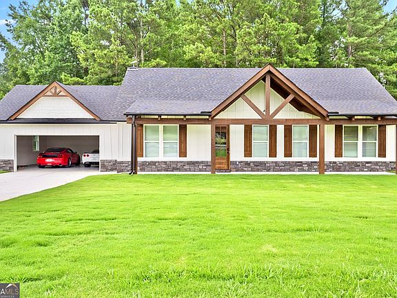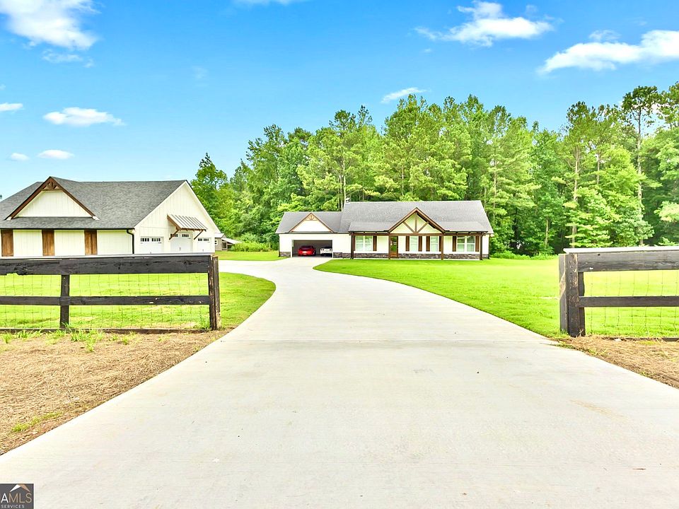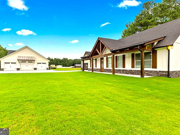 Welcome to a car lover's dream home - a stunning blend of craftsmanship, functionality, and farmhouse charm! Built in 2024, this nearly new property features a beautifully designed modern farmhouse offering 1,600 square feet of living space paired with an impressive, almost 3,000 square feet of total garage and outdoor living space. Step inside to find soaring ceilings, an open-concept living area, and a designer kitchen complete with a large island, luxurious quartz countertops, and stainless steel appliances. The home's architectural character shines through its rough-cut timber front and back porches, perfect for enjoying peaceful mornings or evening sunsets. Outside, you'll find an attached oversized 2-car garage for everyday convenience, plus a massive detached 4-car garage/workshop (approximately 1,548 sq ft) with full power and space for vehicles, projects, or even a small business setup. The property sits on 1 acre of manicured and sodded land, complete with an oversized driveway with ample turnaround space, and plenty of room for additional parking. Located in the highly sought-after city of Bremen, GA, this home even features its own built-in acceleration lane on US Hwy 78, offering easy access while maintaining privacy and curb appeal. Every detail has been thoughtfully designed for both comfort and practicality - a rare find combining beauty, utility, and the City of Bremen, small-town convenience. Come experience this exceptional 2024-built home today - where modern comfort meets timeless farmhouse style!